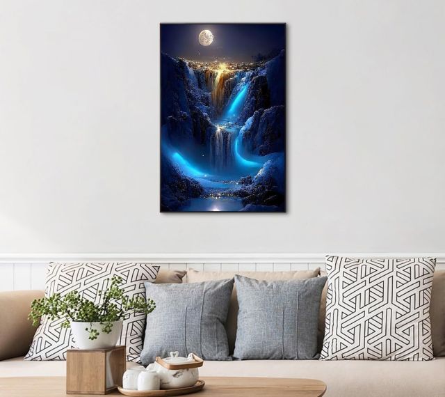この作品を壁に掛けた瞬間、部屋の温度が少しだけ変わったように感じられるはずです。それは、デジタルな日常の中に、自然と宇宙の調和というアナログで根源的な癒やしが持ち込まれるからです。疲れて帰宅した夜、月明かりに照らされた滝の景色を見つめるだけで、心の中の霧が晴れていくような感覚を覚えることでしょう。